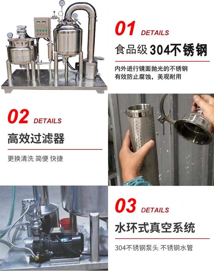 應和真空泵一直要開著,冷卻水的溫度越低越好。在濃縮過程中排出的二次蒸汽經過冷凝器被及時冷卻成水進入回收罐。